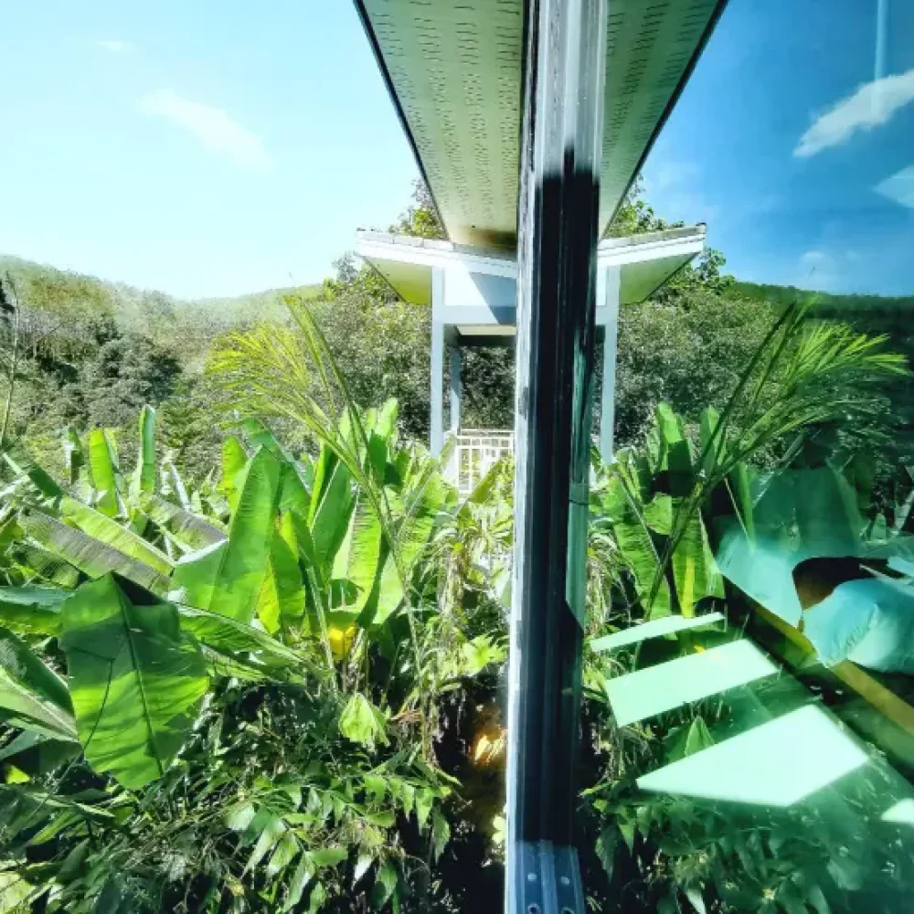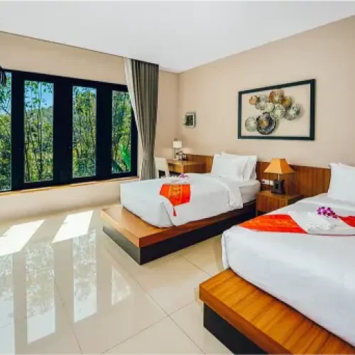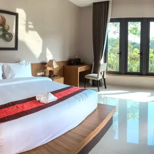 Grand Mountain View: Night sky with full moon in the clouds. You will find comfortable King size bed/Twin bed with luxurious and attractive pure cotton linens, this room is 48 sqm.  The most beautiful view of the mountain skyline while also facing spectacular panoramic view of endless greenery. The interior decoration in the guest villas is workshop style with optimum use of space and furniture. Large glass doors lead you to a private balcony and a semi-outdoor bathroom with a spacious outdoor shower.